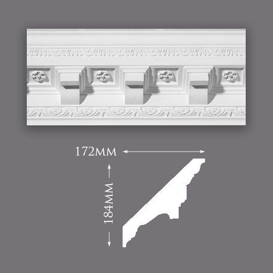 Plaster Cornice C0054 - Projection 172mm, Depth 184mm, Length 2935mm, Pattern Repeat 210mm