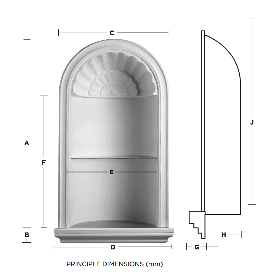 The Palladio Plaster Niche creates a decorative display setting in a wall, hallway or gallery and can be supplied with glass shelves or a frosted glass base with illumination. Fibrous Plaster Niche - Palladio - Measurements: A: 1470mm, B: 115mm, C: 855mm, D: 905mm, E: 665mm, F: 1030mm, G: 70mm, H: 400mm, J: 1450mm